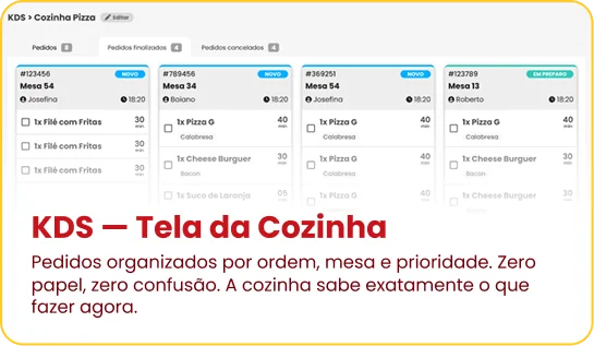 O KDS mostra pedidos em tempo real. O garçom